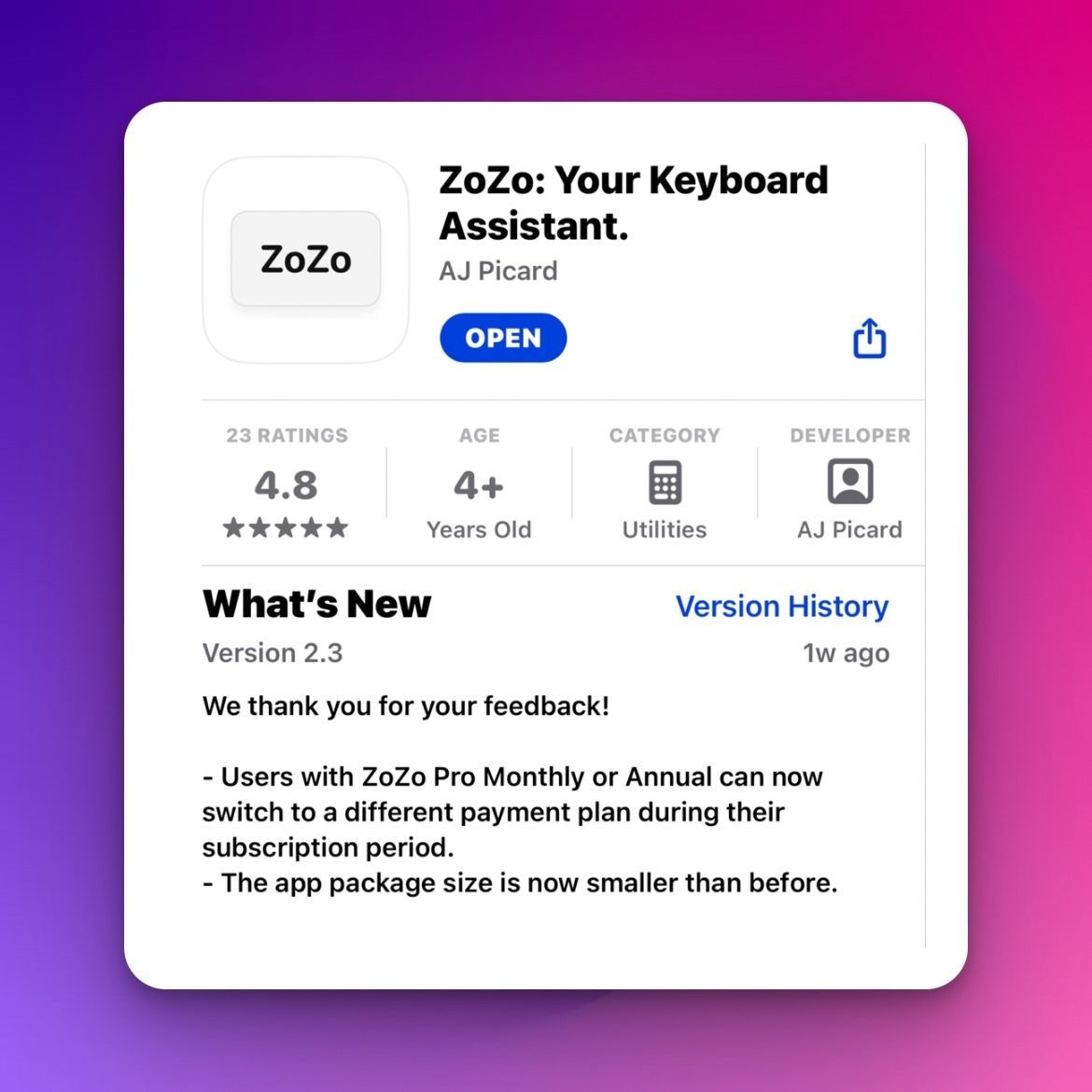 Users can now switch between ZoZo Pro Monthly / Yearly and we reduced the size of the App so it doesn’t take up as much memory on your device.